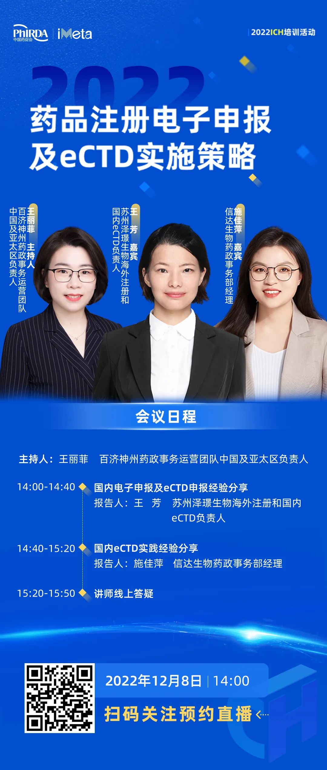 首期中国医药创新促进会ICH指导原则系列培训将于12月8日14:00与大家见面,围绕药品注册电子申报及eCTD实施策略展开探讨。会议特邀苏州泽璟生物医药股份有限公司海外注册和国内eCTD负责人王芳,信达生物制药(苏州)有限公司药政事务部经理施佳萍担任主讲报告人;百济神州(上海)生物科技有限公司,药政事务运营团队中国及亚太区负责人王丽菲担任会议主持人。届时各位专家将就药品注册申请电子申报和eCTD编写与递交过程中的实际执行堵点进行案例分析讲解,并对观众提出的问题予以解答,欢迎线上观众参与交流和互动。