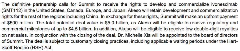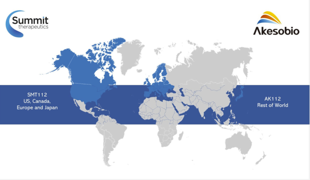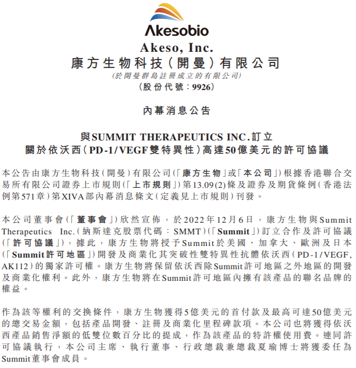 2022年12月6日,康方生物宣布与Summit Therapeutics达成合作协议,后者获得康方生物PD-1/VEGF双抗AK112在美国、加拿大、欧洲、加拿大和日本的权益,Summit支付5亿美元预付款,以及最高50亿美元的总交易金额,包括开发、注册、商业化里程碑金额。