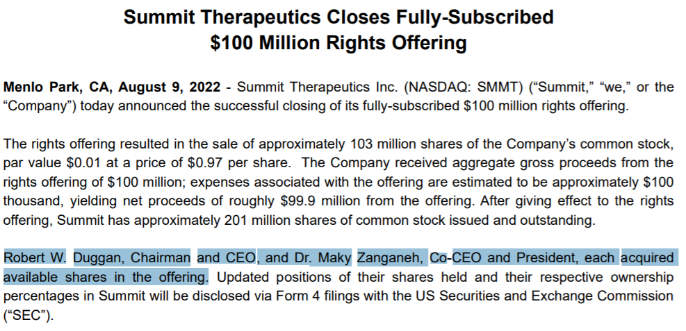 其实问题并不复杂,Summit虽然体量小且名不见经传,但其CEO和最大股东Robert W.Duggan(持有81%的普通股)却是生物医药行业的一位传奇人物。