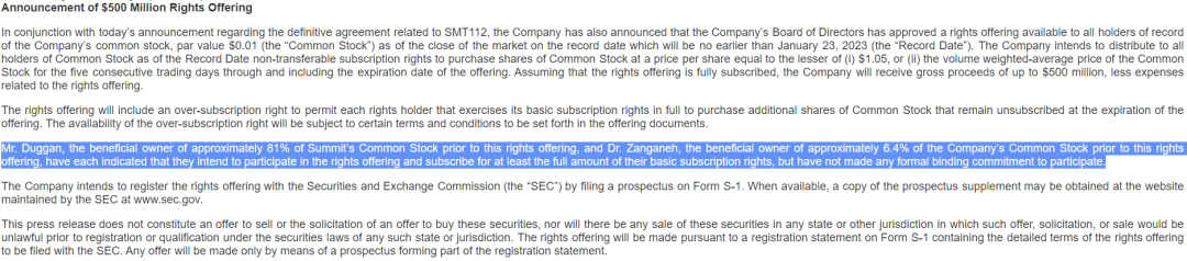 回到Summit与康方生物的合作,Duggan作为Summit的最大股东,这更像是一家私人公司。此次合作协议发布的同时,Summit同时宣布将增发募资5亿美元,并且大股东Duggan和二股东Maky Zanganeh(公司co-CEO兼总裁)都表示将参与此次增发融资,并表示至少认购基本认购权,但还没有签订正式承诺函。同时,Summit对Duggan、MakyZanganeh发行5.2亿美元无担保票据,Duggan支付5亿美元,其中4亿美元在2023年2月15日前兑现,1亿美元在2023年9月15日前兑现,Zanganeh在2023年2月15日前兑现2000万美元。简言之,Duggan先是个人收购了Summit,然后继续个人出资给Summit配股融资,来买AK112,此前的2亿美元左右,加上本次的5亿美元,投资已经达到7亿美元,核心管线也变成了AK112。