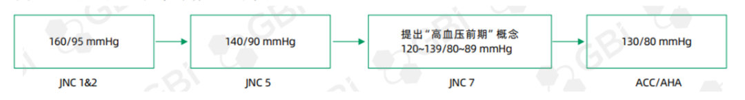 自美国预防、检测、评估和治疗高血压委员会(JNC)1977年发布JNC 1指南起,学界针对高血压诊断及干预的界值展开了大量探索。JNC最早将SBP/DBP≥160/95 mmHg视为血压升高(JNC 1),并在1980年发布的JNC 2指南中首次明确DBP≥95mmHg应作为高血压的诊断标准。1993年,JNC 5指南首次将收缩压纳入高血压的诊断依据,将SBP/DBP≥140/90mmHg作为诊断标准,形成当今普遍采用的界值雏形3。