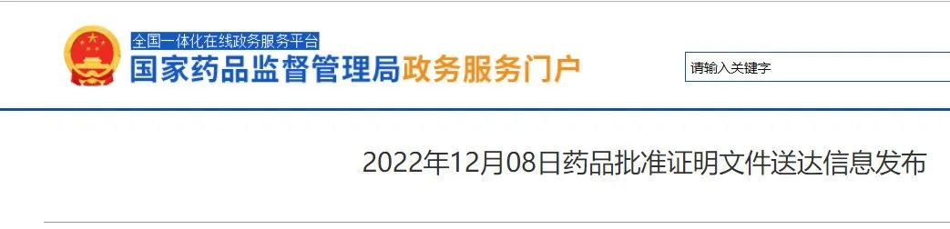 [1]2022年12月08日药品批准证明文件送达信息发布. Retrieved Dec 8 , 2022. From https://www.nmpa.gov.cn/zwfw/sdxx/sdxxyp/yppjfb/20221208092804174.html