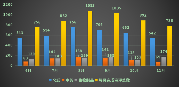2022年11月份<注:状态开始时间(药智)从2022年11月1日至2022年11月30日>完成审评的受理号共785个,其中化药受理542个,中药受理69个,生物制品受理174个;2022年6-11月各类药品完成审评情况详见图2。