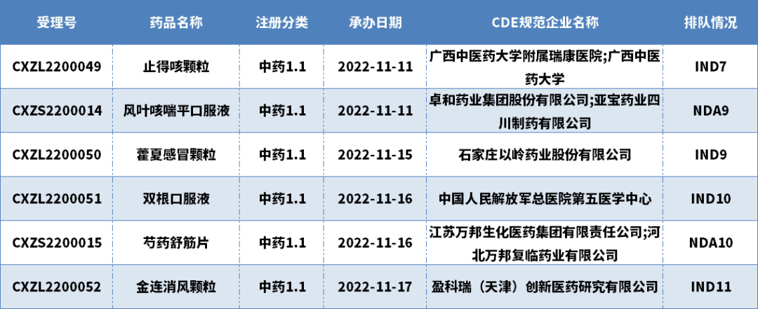 11月共承办6个中药1类创新药,共涉及6个品种,其中是IND申请4个,NDA申请2个;下表为11月新承办的中药新药。