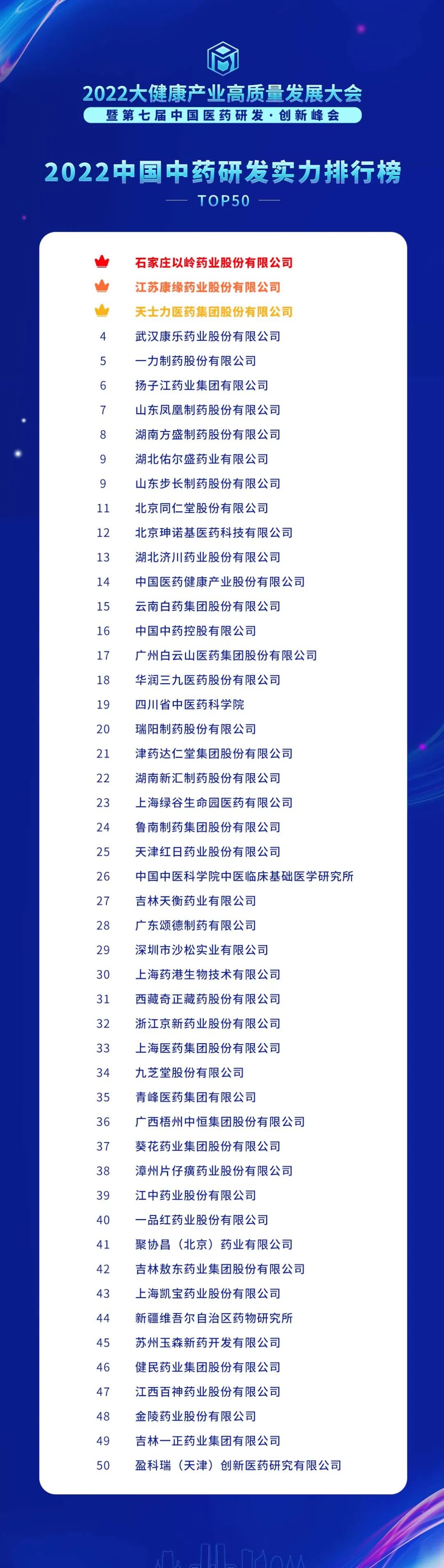 2022年12月9日,“2022大健康产业高质量发展大会暨第七届中国医药研发·创新峰会(PDI)”发布《2022中国中药研发实力排行榜TOP50》(以下简称“《中药榜》”),50家领跑中医药创新前沿。(推荐阅读:荣耀巅峰!2022中国药品研发实力排行榜系列榜单隆重发布)