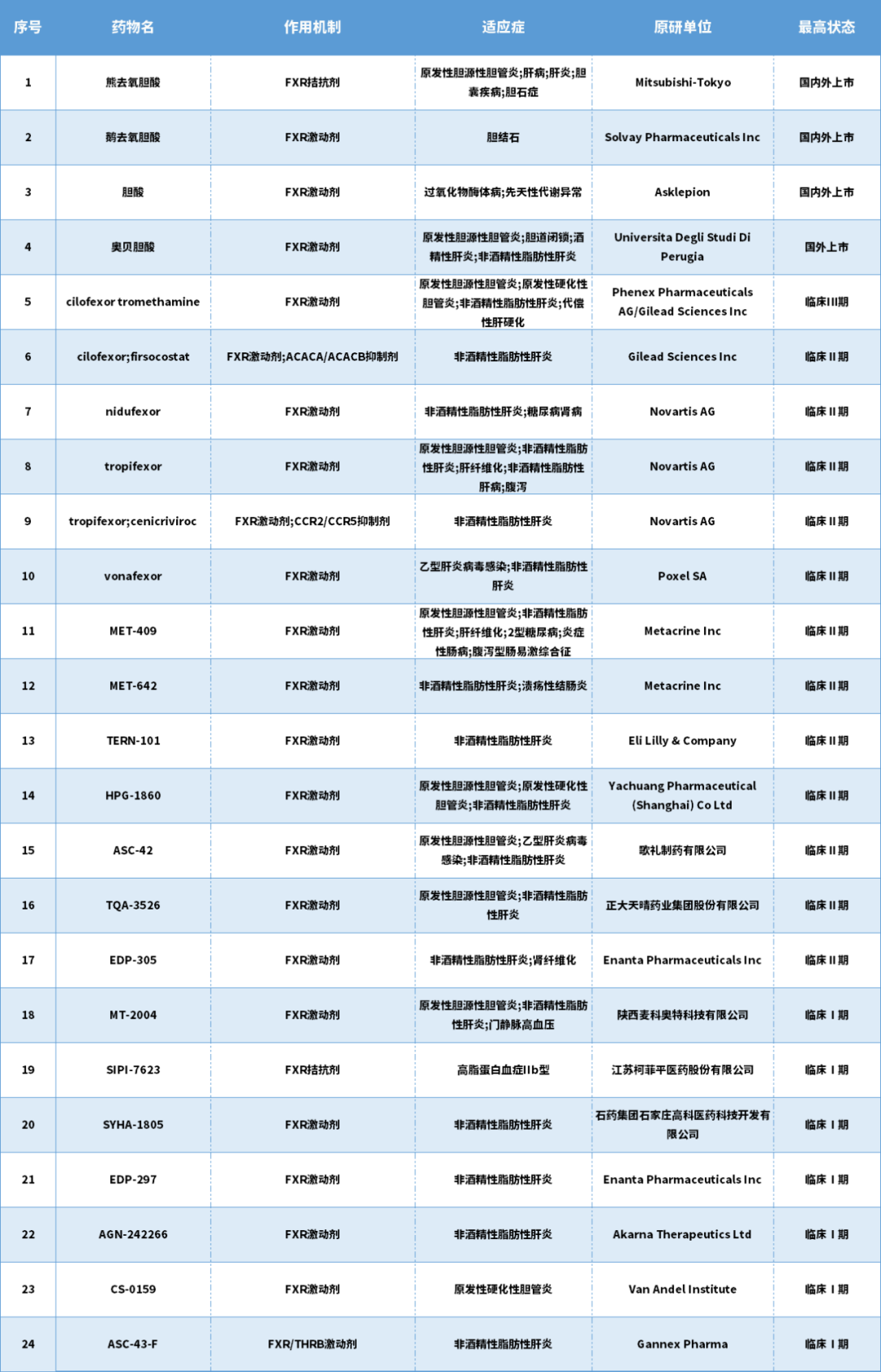 全球FXR调节剂上市在研情况