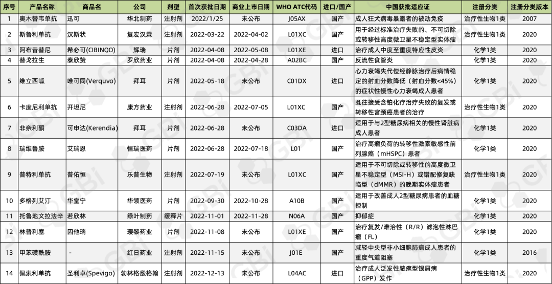 据GBI SOURCE全球药品数据库,截至2022年12月19日 ,共有14个1类新药在中国获批上市(详见表1),包含4个进口新药和10个国产新药。药品类别方面,治疗用生物制品为5个,分别为华北制药奥木替韦单抗、复宏汉霖斯鲁利单抗、康方药业卡度尼利单抗、乐普生物普特利单抗以及勃林格殷格翰佩索利单抗。治疗领域方面,主要涉及抗肿瘤、心血管、抗抑郁等。