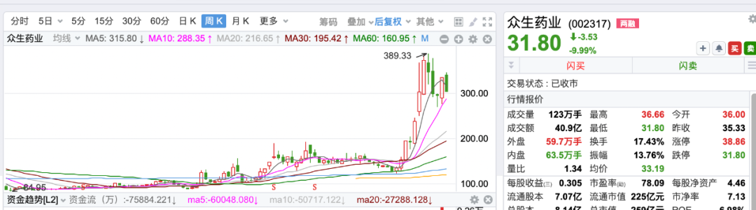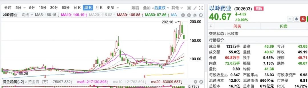 除了产品受热捧外,以岭药业股价近期也持续走高。据公开数据,以岭药业股价股价三个月涨幅超200%,在12月7日迎来涨停,当日收盘于49.12元/股。紧接着次日,以岭药业开盘上涨,盘中股价触及53.96元/股,再度刷新历史新高。日内成交额超100亿,总市值近900亿。这一位置更是较今年9月末以岭药业不到20元/股的股价翻了2.5倍。