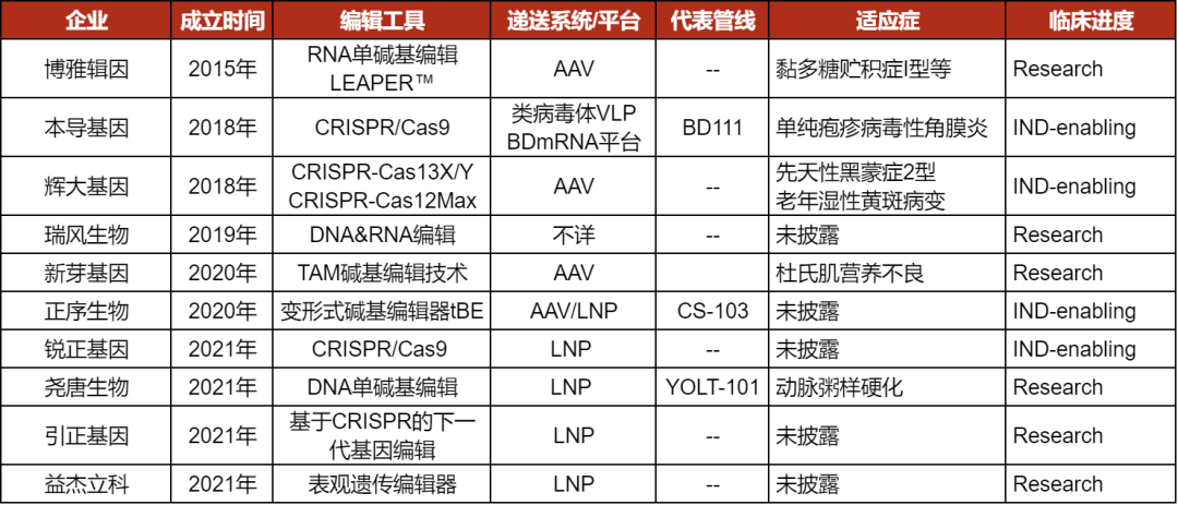 近年来国内也涌现出一批致力于先进基因编辑疗法开发的企业,其中包括邦耀生物、博雅辑因、瑞风生物、引正基因、本导基因、辉大基因、新芽基因、锐正基因、正序生物、尧唐生物、科金生物、益杰立科等10余家公司,各自均有自己独特的基因编辑系统,根据公开资料,其中绝大部分都已布局体内基因编辑疗法开发。