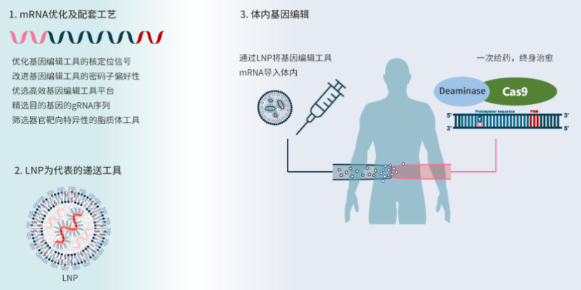 公司着重发展以碱基编辑为代表的新一代基因编辑工具,通过多样的基因编辑策略选择,全面实现基因删除、替换、插入等多种功能,并通过高通量的全新编辑工具挖掘和高通量分子进化平台,实现基因编辑工具的快速迭代,提高基因编辑效率以及安全性;并持续研发可获得自主产权的多种脂质体材料,丰富靶向肝脏及其他组织器官的递送载体。mRNA-LNP为主的体内递送非常适合基因编辑工具的瞬时表达,可在实现高效基因编辑的同时,有效减少脱靶风险。