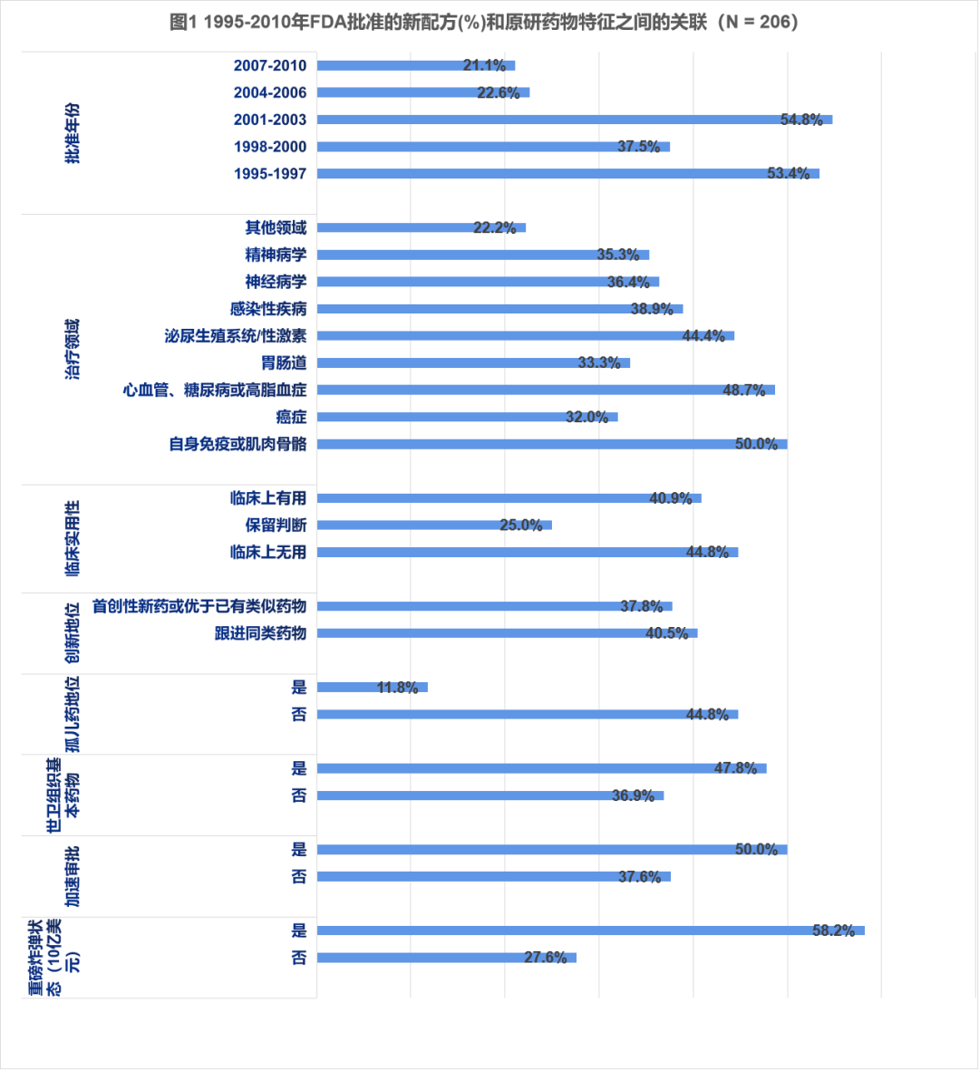 在1995年至2010年FDA批准的206种片剂或胶囊剂型的新药中,超过三分之一的新药在2021前至少有1种新配方获得批准,其中重磅炸弹级和加速批准的药物药物开发新配方获批上市比例明显增高,而其他的治疗价值的衡量标准(包括创新性和临床价值)与新配方的批准比例无关。