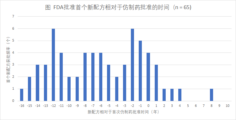 在同时至少有一种新配方和一种仿制药的65种新药中,55种(84.6%)新配方在首次仿制药批准前获得批准,10种(15.4%)在仿制药批准后获得批准。由此可见,首次新配方如果不能赶在首次仿制药产品获批准之前上市,其获批的可能性较小。
