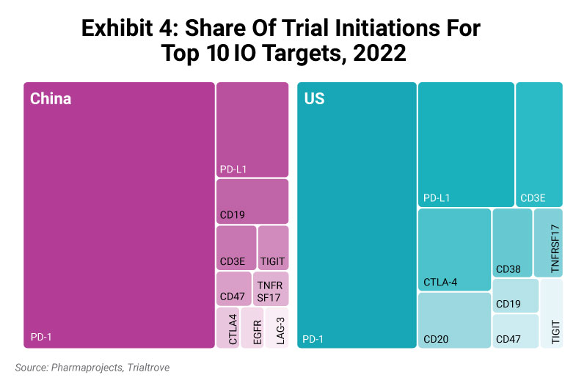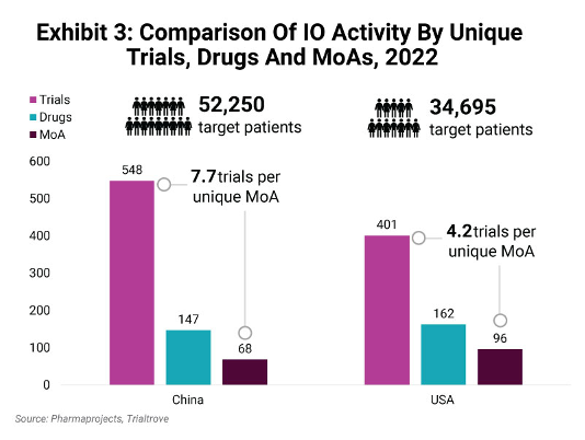 同时,虽然2022年在中国启动的IO试验比美国多了约37%,但Pharma Intelligence分析指出,在美国开展研究的独有药品和靶点数量却更高。