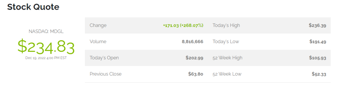 随着这一消息的公布,Madrigal Pharmaceuticals 公司股价大幅增长,截止目前,该公司股价涨幅已超 268%,达 234.83 美元,公司总市值达到 40.15 亿美元。
