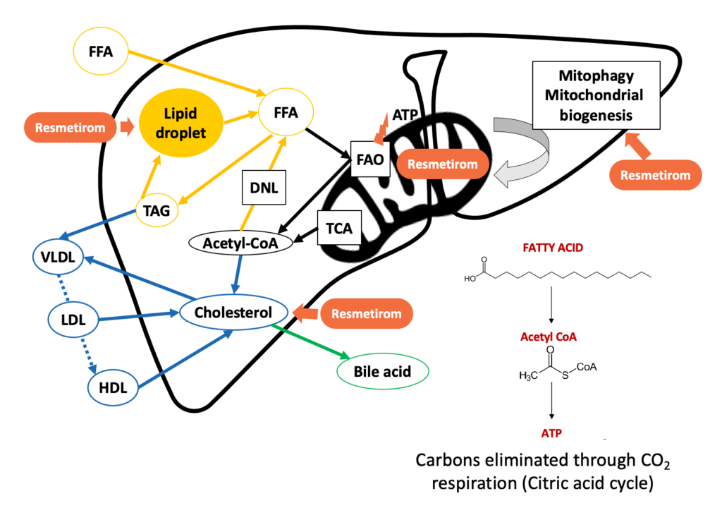 甲状腺激素通过激活肝脏细胞中的 β 受体在肝脏功能中发挥核心作用,比如维持血清胆固醇和甘油三酯水平等。THR-β 是维持正常肝脏功能的关键,包括调节线粒体活性(例如肝脏脂肪分解)以及控制正常、健康的线粒体水平,而在 NASH 患者中,肝脏中 THR-β 受体活性水平降低。因此为了优化 THR-β 通路在肝病治疗中的有效性,至关重要的一点是要保持 THR-α 受体活性。