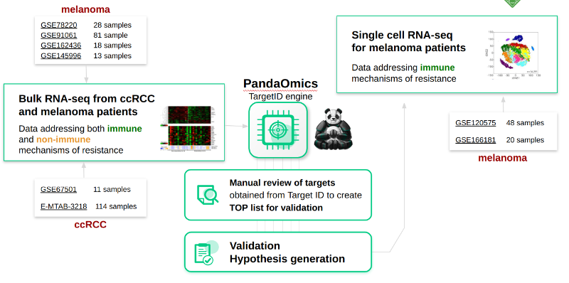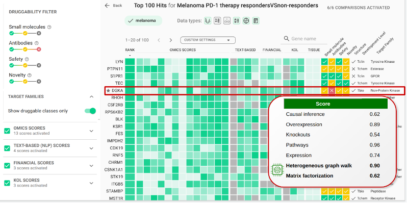 在立项之初,英矽智能的研发团队利用PandaOmics靶点识别引擎,综合23个人工智能模型评估的分数后,得到了一个囊括100个潜在靶点的排名列表,其中DGKA在多个筛选项下的均被列为最优或次优的选择。“我们在项目中使用了6个RNAseq数据集,包括4个黑色素瘤患者数据集和2个肾癌患者数据集。”孙德恒博士介绍道,“我们还在两2个黑色素瘤患者的单细胞测序数据集上进行了验证,结果表明,DGKA在PD-1抗体介导的耐药中发挥非常重要的作用,抑制DGKA可以使T细胞从失能状态充分激活,从而提高免疫检查点抑制剂的临床响应率。”