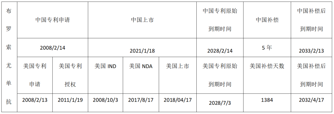 表 1. 布罗索尤单抗中美专利期补偿时间