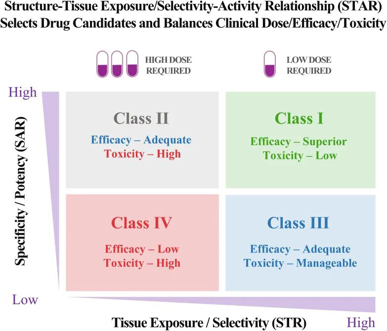 图:结构-组织选择性/暴露-活性关系(STAR)可选择更好的候选药物并平衡临床剂量/疗效/毒性,以改善药物优化,从而成功进行临床药物开发