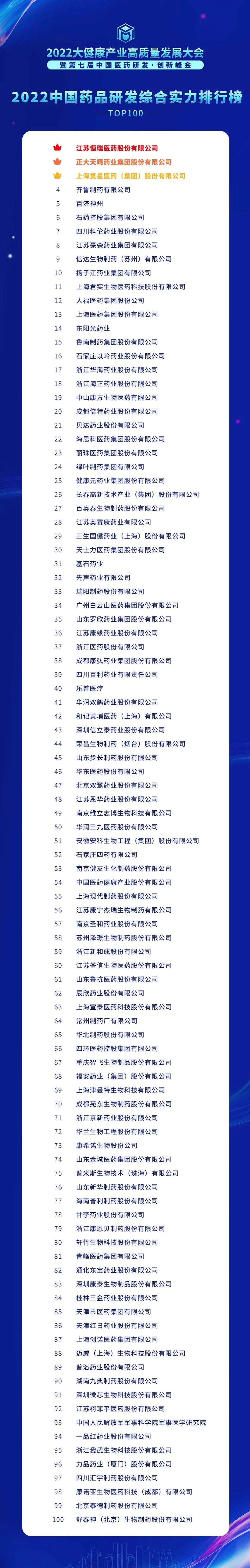 《2022中国药品研发综合实力排行榜TOP100》前三甲分别为恒瑞医药、正大天晴、复星医药;其中恒瑞医药第5年蝉联“总榜”冠军,正大天晴、复星医药与2021年度相比,稳居第二、第三名;
