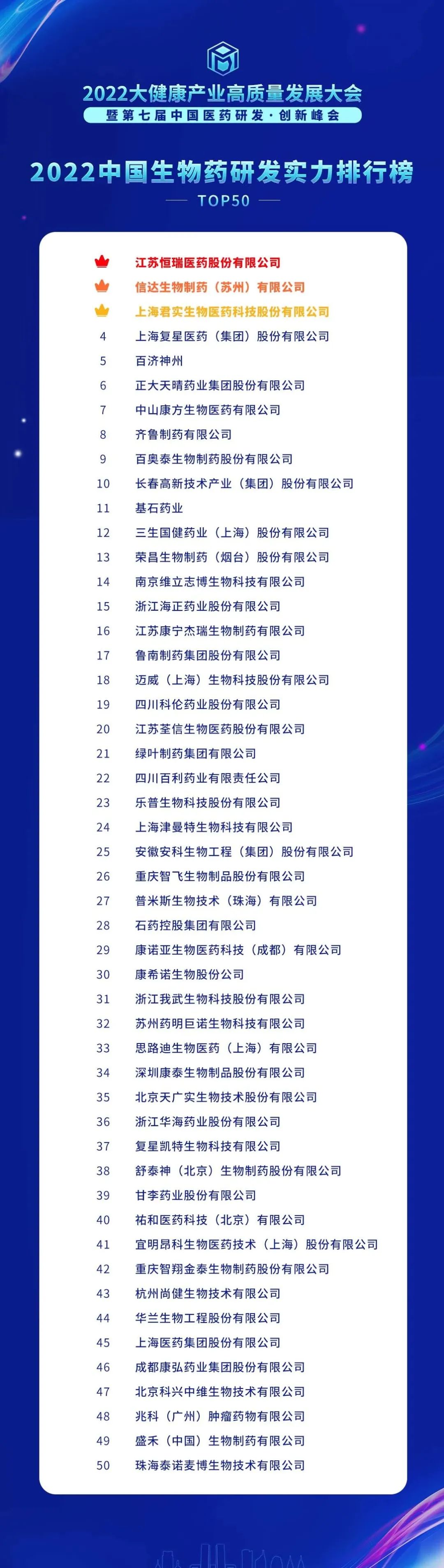 《2022中国生物药研发实力排行榜TOP50》前三名和去年一样,依旧是恒瑞医药、信达生物、君实生物。