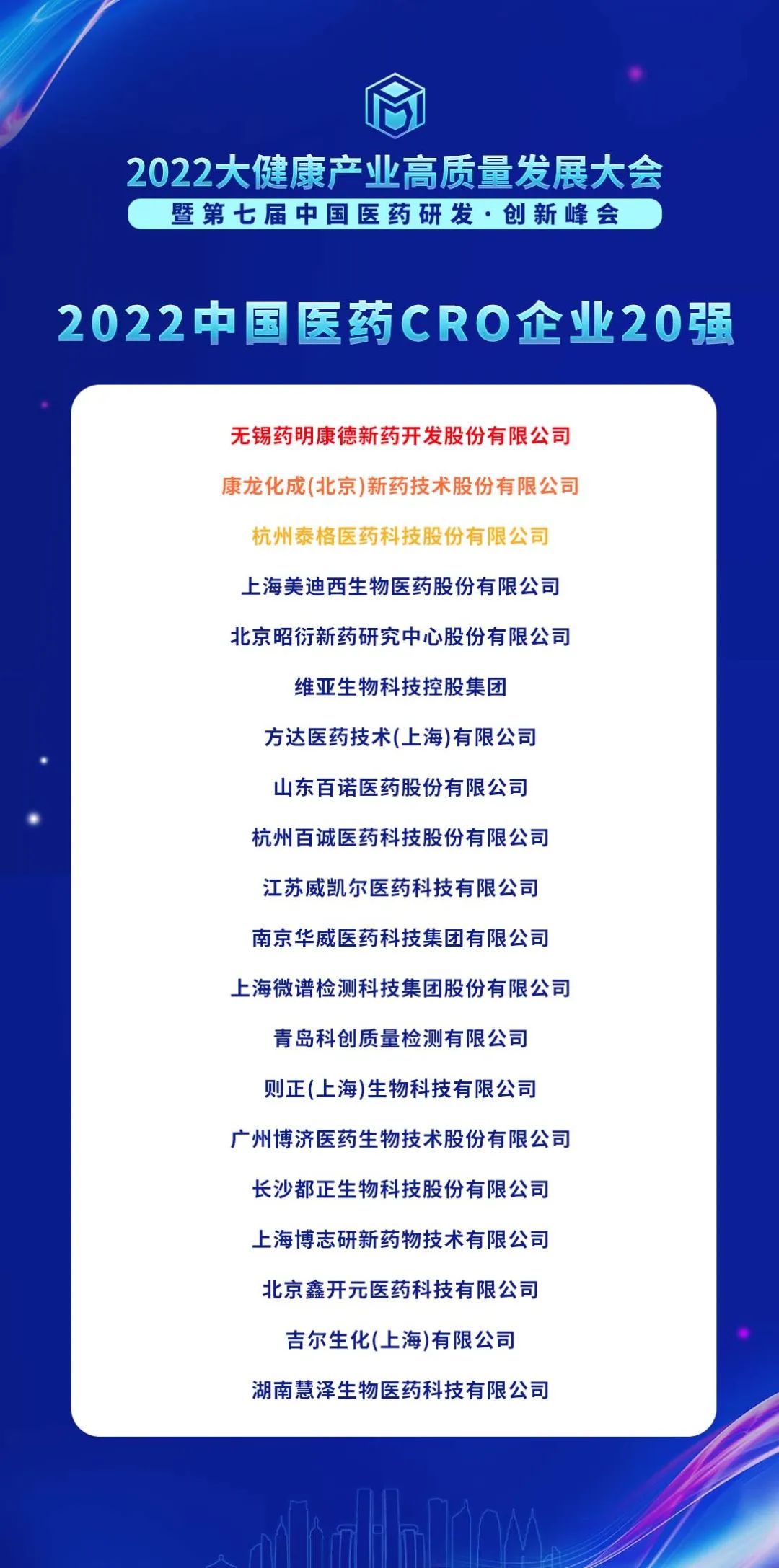 《2022中国医药CRO企业20强》药明康德、康龙化成、泰格医药等企业荣耀入榜;