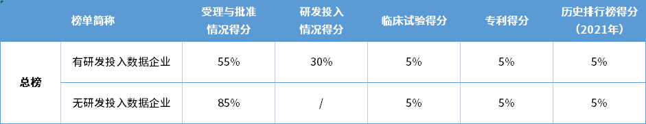 《总榜》由2021年度的药品受理批准情况得分、药企研发投入资金情况得分、药品临床试验得分、专利得分及企业历史药品研发排行榜得分(2021年)五部分按比例计算所得。