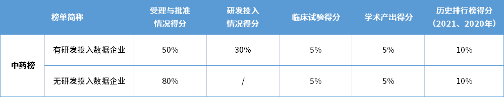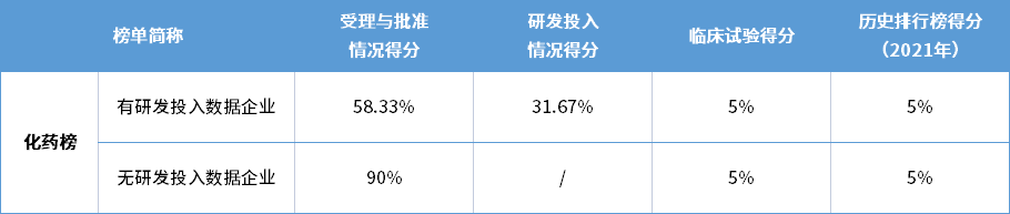 注:历史排行榜得分项中:2021中国药品研发实力排行榜得分占6%,2020中国药品研发实力排行榜得分占4%;
