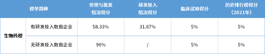 其中研发投入情况只针对上市企业或提供审计数据的企业,没有研发投入数据的企业不计算该项。没有研发投入数据的企业总分由2021年度的药品受理批准情况得分、药品临床试验完成情况得分及企业历史药品研发排行榜得分(2021年)三部分组成(各部分所占比例如表2所示)。