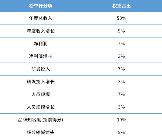 排行榜评分涉及多个指标,包括企业年度总收入(营业总收入)、年度收入增长(%)、净利润、净利润增长(%)、研发投入、研发投入增长(%)、人员规模、人员规模增长(%)、品牌知名度(投票得分)、细分领域龙头等10项指标,各个指标占比如下表所示,上市企业直接调用年报数据,非上市公司由企业提交数据并经专家委员会确认。