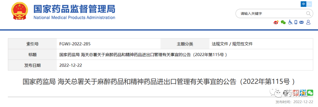 本公告自2023年1月1日起施行。本公告实施前国家药监局核发的进口准许证在有效期内可继续使用。2001年12月31日原国家药品监督管理局、海关总署联合发布的《关于加强麻醉药品精神药品进出口管理有关问题的通知》(国药监安〔2001〕585号)同时废止。