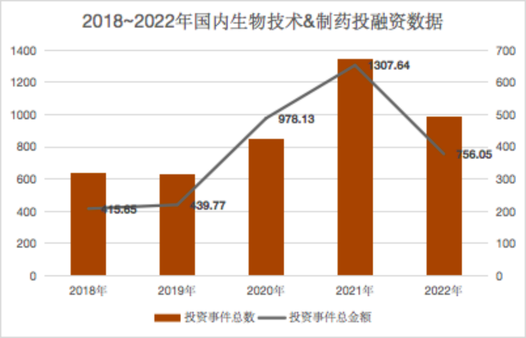 据E药经理人数据统计,截至12月23日,2022年度国内生物技术和制药领域共发生495起投融资事件,融资披露总金额约756.05亿元。相比2021年,投资事件减少179件,披露总金额减少约552亿元,下滑幅度超过40%。