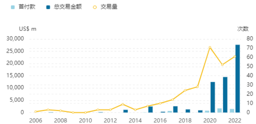 随着中国生物医药产业的崛起、国际间交流融合深度的增加和行业信用的提升,中国创新药license out更加常态化。医药魔方Nextpharma数据库显示,截止到12月26日,中国创新药/新技术license out总交易金额仍达到历史最高(276.52亿美元),较2021年(141.86)增长48.7%。交易数量也较2021年多(61 vs 52)。这证实了境外药企对中国企业创新实力的认可,也说明即使在全球资本市场萧条、企业现金流紧张情况下,好的项目仍能找到合适的“买主”。
