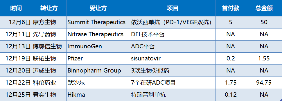 尤其是进入年底,中国创新药出海势头不减,并且交易总金额在不断刷新。继康方生物以最高可达50亿美元“出海”Summit Therapeutics之后,科伦药业则将总交易额推高至接近100亿美元。