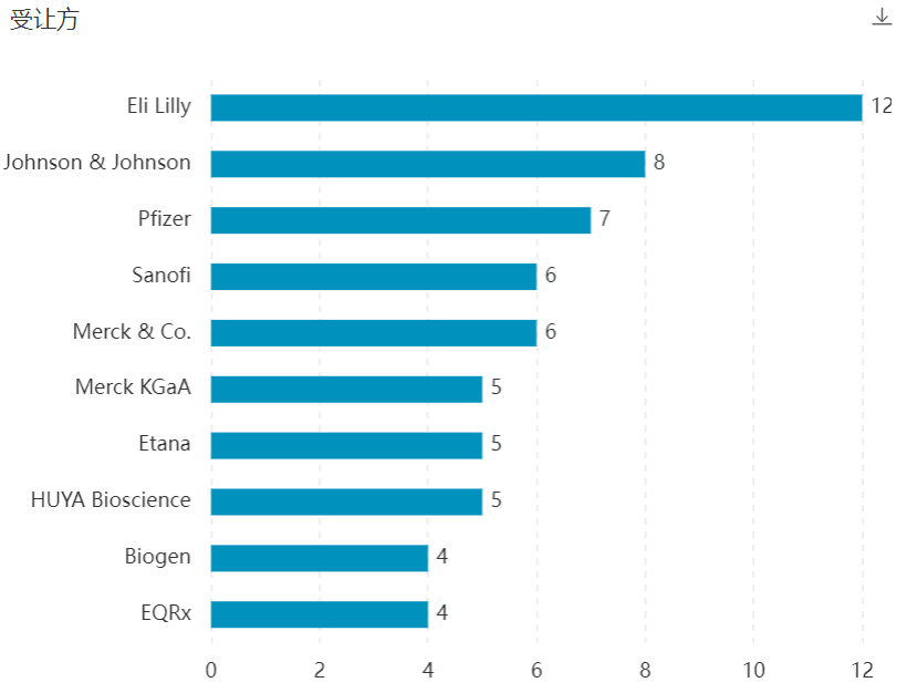 中国创新药企业近几年如雨后春笋般出现,能够被跨国大药企相中并以股权投资背书的创新药企也越来越多。根据医药魔方Nextpharma数据库,中国创新药license out项目中,受让方最多的境外药企分别是礼来(12)、强生(8)、辉瑞(7)、赛诺菲(6)及默沙东(6)等。
