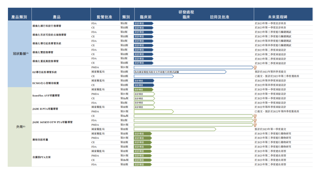 业聚医疗的多元化产品组合涵盖了PCI手术及PTA手术中的所有主要治疗过程。截至2022年上半年结束,业聚医疗共有逾40种获批产品,分别包括25款获日本厚生劳动省批准的产品(均分类为IV类)、22款获欧盟CE标志产品(4款分类为IIa类及18款分类为III类)、14款获美国FDA许可或批准产品(13款分类为II类及1款分类为III类)及15款获中国国家药监局批准产品(均分类为III类)。