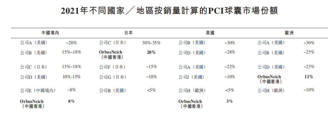 就2021年PCI球囊的销量而言,业聚医疗在日本市场排名第二,在欧洲市场排名第四,在中国境内及美国市场均排名第六,市场份额分别为20%、11%、8%及3%;就2021年PCI支架的销量而言,业聚医疗在日本及欧洲的市场份额分别约为2%及0.3%。