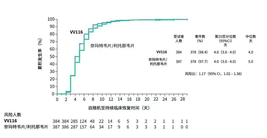 根据最终分析结果(截至 2022年 8 月 18 日),在 FAS 人群中,VV116 与PAXLOVID 在「至持续临床恢复的时间」达到非劣效(HR=1.17,95%CI:1.02~1.36),且 VV116 组比 PAXLOVID 组的中位恢复时间更短(4 天 vs. 5 天)。