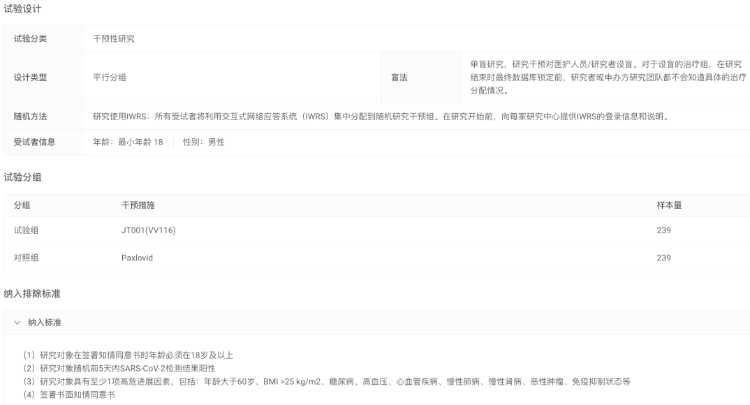 比如,同样针对轻中度 COVID-19 患者,君实在 10 月份启动的 III 期临床研究(登记号:NCT05582629)采用双盲、安慰剂对照。在该试验中纳入的患者并非一定要伴有高危风险 COVID-19 患者,意味着试验可参与人群相对更广泛。