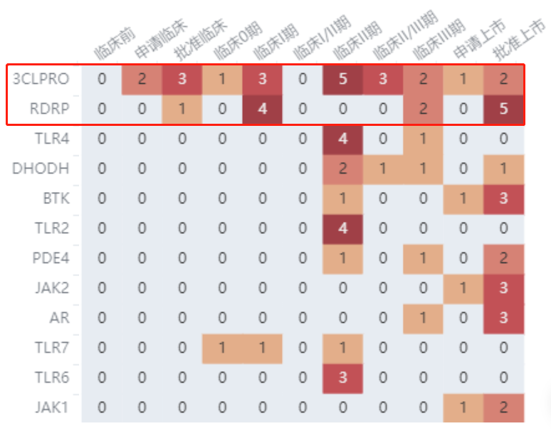 据 Insight 数据库显示,目前国内新冠小分子化药的研发主要集中在 3CLPRO 和 RDRP 这两个靶点上。
