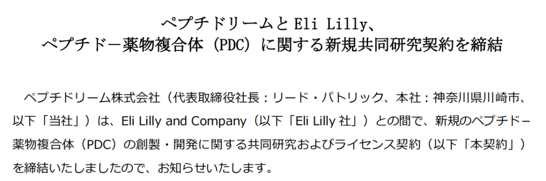 12 月 26 日,日本生物技术公司PeptiDream宣布已与美国礼来公司就创新肽药物偶联物(PDC)的创建和开发达成联合研究和许可协议。PeptiDream 确定了独特的环状肽,这些肽对礼来公司使用其自己的药物发现开发平台选择的多个目标具有高结合特性。PeptiDream 负责肽的创建和优化,Lilly 负责有效载荷的创建和优化。创建的 PDC 将由 Lilly 开发。PeptiDream 将从礼来公司获得预付款,并可能获得高达 12.35 亿美元(1630 亿日元)的潜在开发和商业里程碑付款。公司也有权在发布后根据销售额收取版税。
