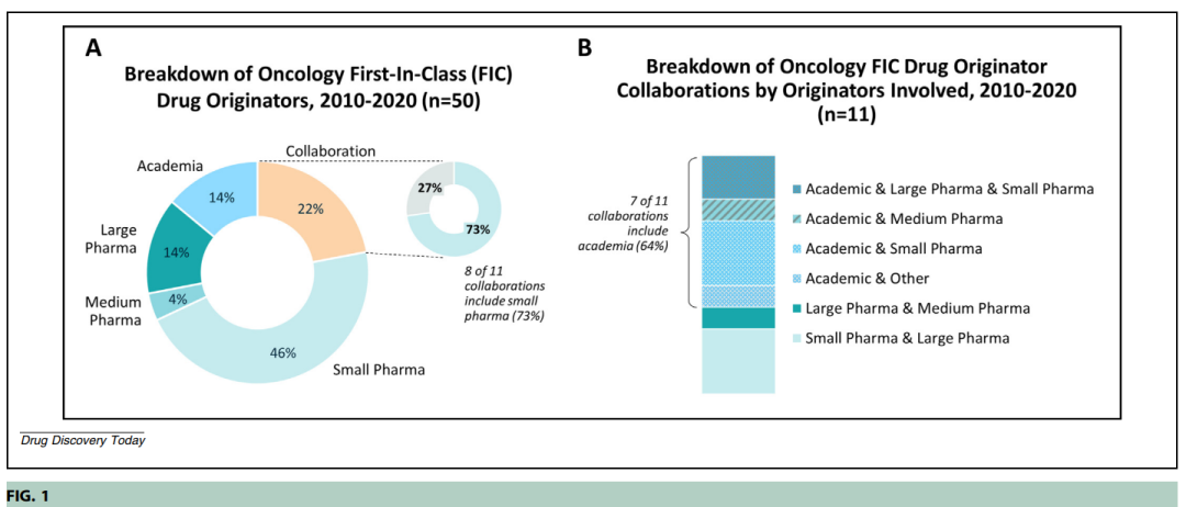 图1:A、2010年至2020年,FDA批准的50款FIC肿瘤药物的发现者。B、11项合作中涉及的发现者类型的细分。
