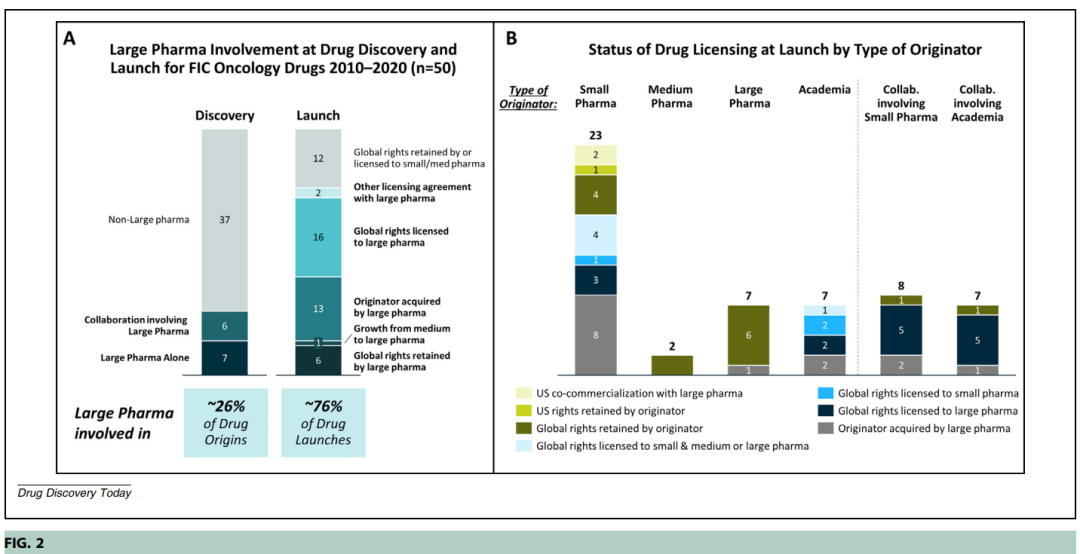 图2:在发现阶段和上市阶段参与发现和开发FIC肿瘤药物的实体。A、大型制药公司参与2010年至2022年FDA批准了50款FIC肿瘤药物的发现和上市。“与大型制药公司签订的其它许可协议”类别包括与大型制药公司在美国的联合促销活动,以及获得许美国之外的权利许可(保留美国权利)。在全球权益许可给大型制药公司的资产中,有三家涉及与小型制药公司的合作。B、按发现者类型分列的上市时的药品许可状况。对于与大型制药公司在美国开展的联合商业化,美国以外的权利被许可给大型制药公司。学术界药物发现者创建的一家分拆公司被大型制药公司收购。对于涉及小型制药公司的合作,拥有该药物的公司后来被大型制药公司收购。