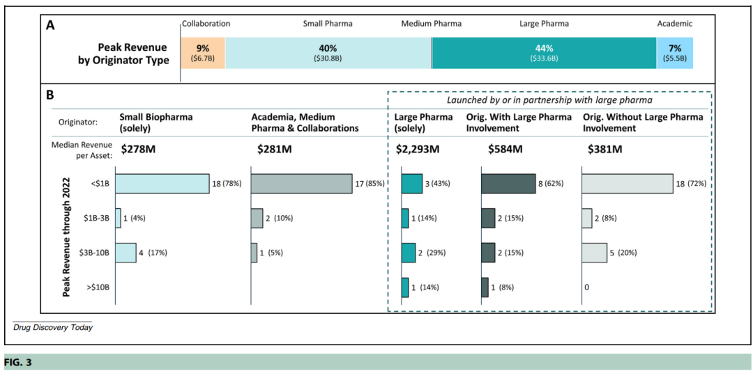 图3:FIC肿瘤药物产生的收入。A、每种产品的最高销售额被定义为从上市到2022年的一个日历年中的最高收入。2010–2021年为实际销售数据用;2022年收入是Evaluate Pharma的分析师一致预测。公司的分类方式与图1相同。B、按峰值收入和发现者类型列出的资产计数。前三个显示了与每个发现者类别相关的所有资产的计数,后三个则显示了大型制药公司或与大型制药公司合作推出的资产的计数。所有仅由大型制药公司发现的资产均由大型制药公司自己上市。