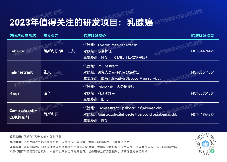 CDK抑制剂同样也是乳腺癌的常见治疗手段。诺华(Novartis)的CDK4/6抑制剂Kisqali(ribociclib)与内分泌疗法联用,去年12月已公布治疗HR阳性、HER2阴性的乳腺癌患者的初步结果。今年,我们有望看到这款疗法的更多3期临床试验数据。阿斯利康的选择性雌激素受体降解药物camizestrant与CDK4/6抑制剂的组合疗法也在一项3期临床中接受检验,有望今年第四季度公布结果。