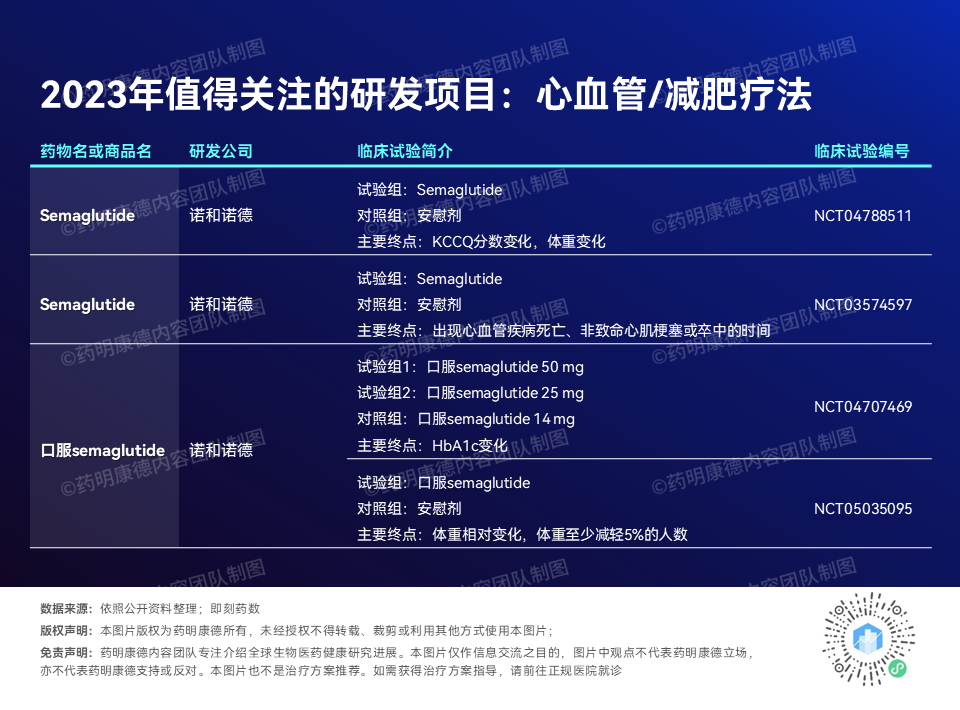 随着近些年一些减肥疗法取得显著进展,这一领域得到了产业越来越多的关注。2023年,同样有几款临床项目入选该榜单,诺和诺德(Novo Nordisk)的司美格鲁肽(semaglutide)占了其中三席,剩下的两个项目则来自礼来的Mounjaro(tirzepatide)。