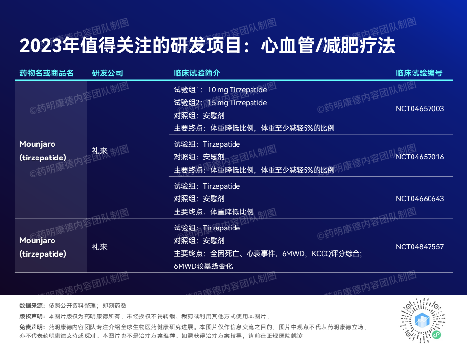 Mounjaro的第一个临床项目涉及三个不同的临床试验,分别评估这款疗法能否在糖尿病患者中减轻体重、在生活发生重大变化的患者中维持体重或促进减肥、以及在肥胖或超重患者中维持体重或减轻体重。第二个临床项目则会评估Mounjaro在肥胖心衰患者中的安全性与疗效。依照Evaluate的报告,这两个临床项目预计分别在今年第二季度和今年下半年公布更多数据。