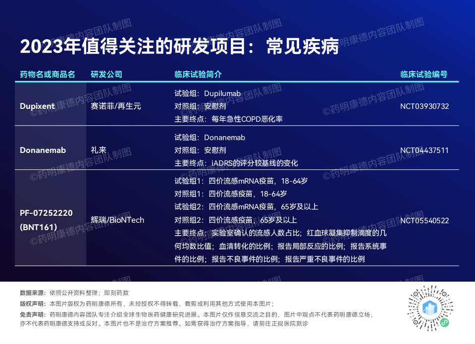 第三款疗法是由辉瑞(Pfizer)和BioNTech开发的PF-07252220(BNT161),这是一款预防流感的mRNA疫苗,将在临床试验中与常规流感疫苗作比较,评估疗效、安全性与耐受性。如果取得成功,将是mRNA疫苗的又一个突破。