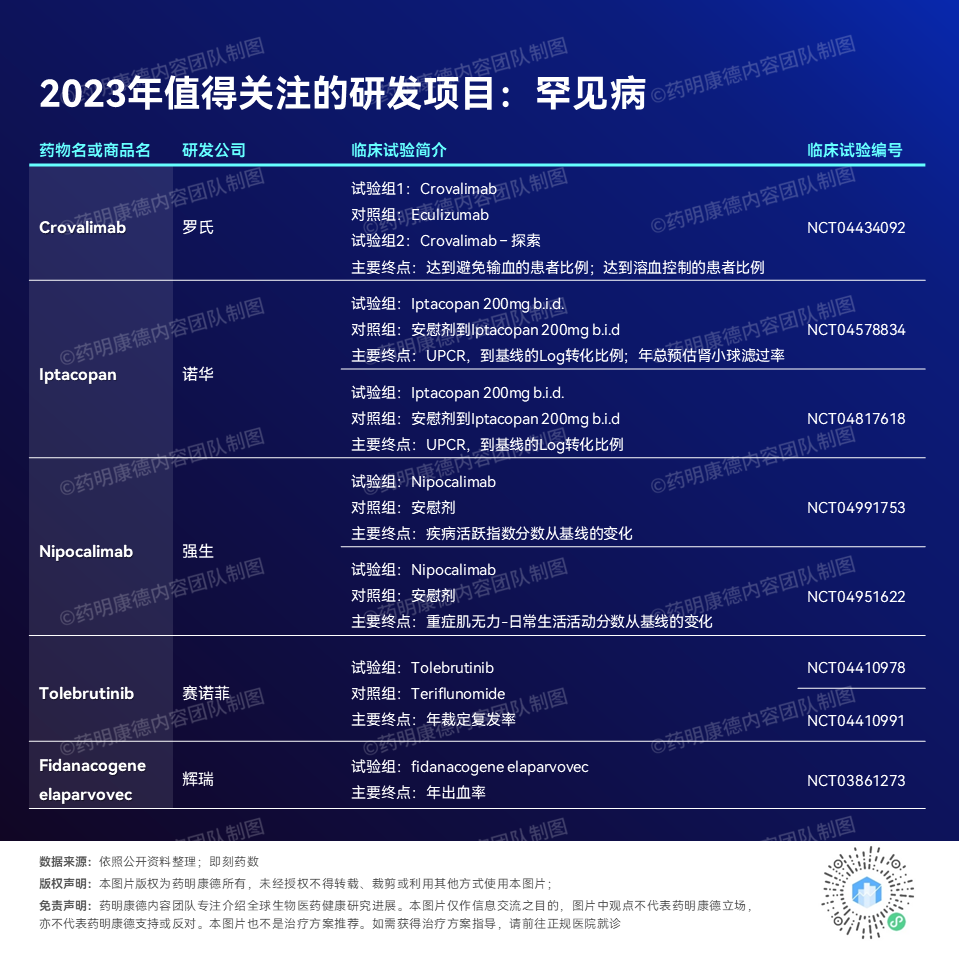 今年还有多款治疗罕见疾病的疗法值得关注,首先是两款靶向补体通路的疗法:罗氏的crovalimab是一款靶向补体蛋白C5的可循环使用的单克隆抗体,治疗阵发性睡眠性血红蛋白尿症(PNH)的3期临床结果预计在今年初公布。诺华的补体因子B抑制剂iptacopan也将公布两项3期临床试验结果,分别治疗原发性IgA肾病,以及C3肾小球病。