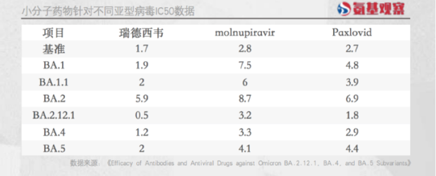 实际上,后续在与奥秘克戎毒株的对垒中,瑞德西韦表现似乎更胜一筹。如下图所示,根据体外测试IC50数据,针对多个奥秘克戎毒株,瑞德西韦活性受到的影响最小。
