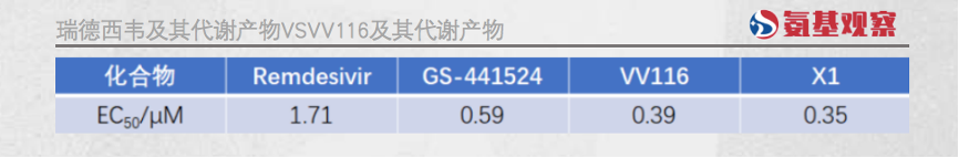 第一,更强的抗病毒能力。如下图所示,VV116及其代谢产物(X1)的半数最大有效浓度(EC50)约是瑞德西韦的1/5,甚至低于GS-441524。